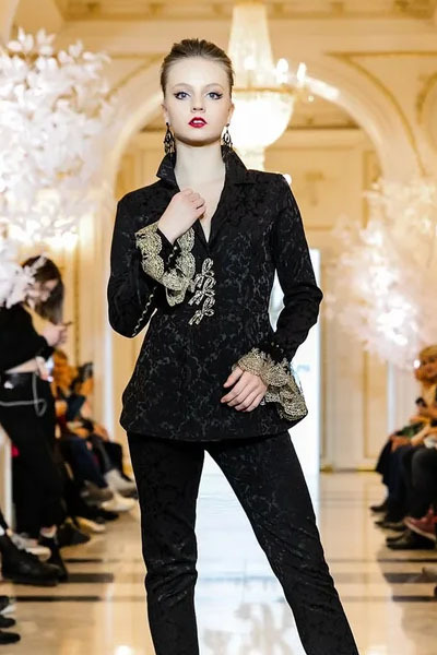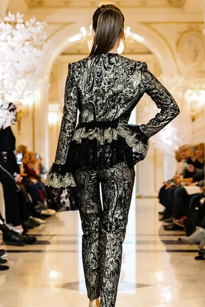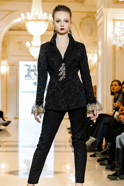 Черный классический костюм с застежкой и отделкой итальянским золотым кружевом
