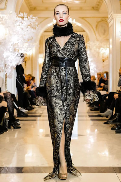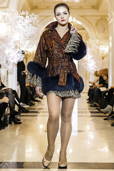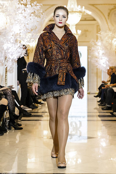 Жаккардовое пальто из коллекции ОСЕНЬ-ЗИМА 2019 с отделкой натуральным мехом и кружевом