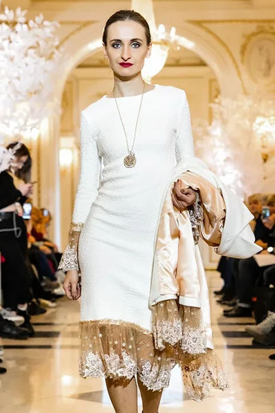 Платье из коллекции ОСЕНЬ-ЗИМА 2019 из белого трикотажа с отделкой итальянским кружевом