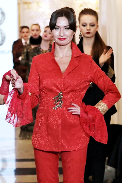 Красный классический костюм с застежкой и отделкой итальянским золотым кружевом